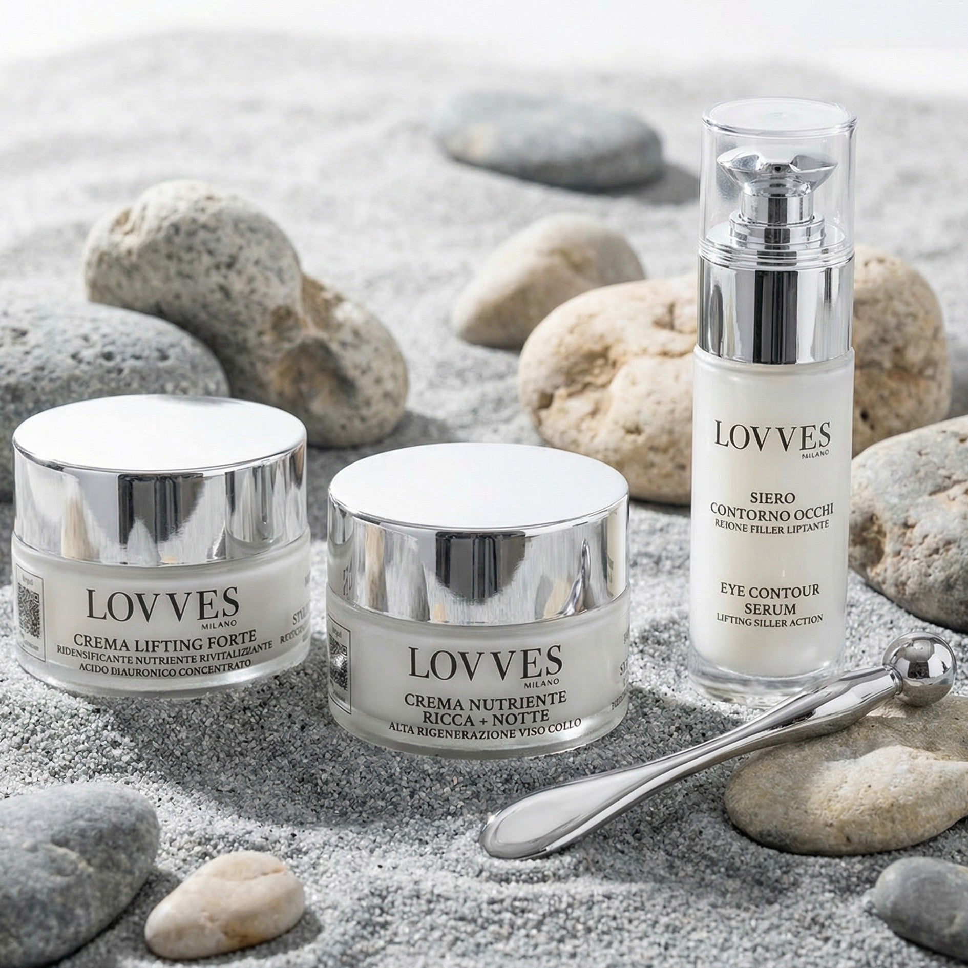 Die Verpackung wird durch eine metallische Kosmetikspatel ergänzt, die mit einer Kugel für die Gesichts- und Augenmassage ausgestattet ist, die die Anwendung erleichtert und die Mikrozirkulation stimuliert, wodurch die Wirksamkeit der in den Produkten enthaltenen Wirkstoffe erhöht wird.